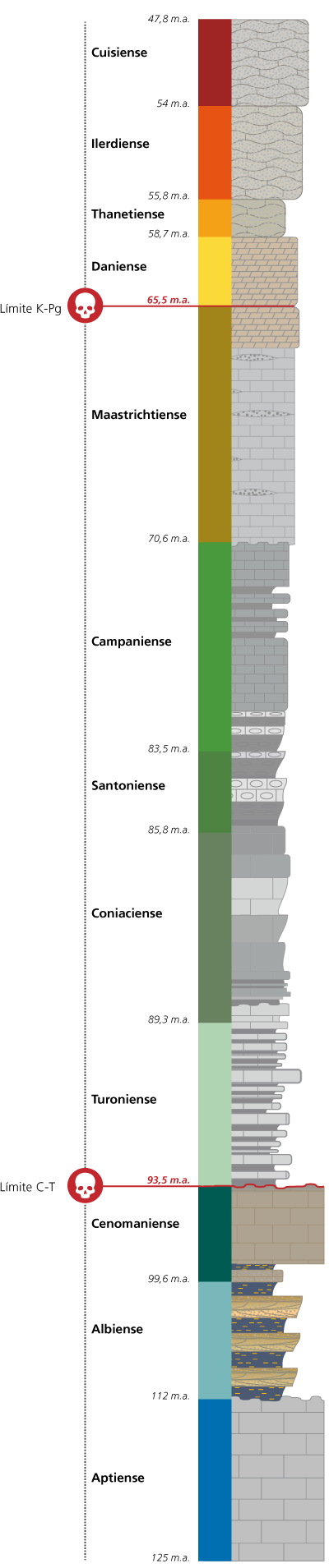 En este gráfico se representan las rocas que afloran en Costa Quebrada. Se indican las edades, expresadas en millones de años (Ma) y su naturaleza. También se representan los dos límites temporales Cenomaniense-Turoniense (C-T) y Cretácico-Paleógeno (K-Pg o, antiguamente, K-T) relacionados con extinciones biológicas.